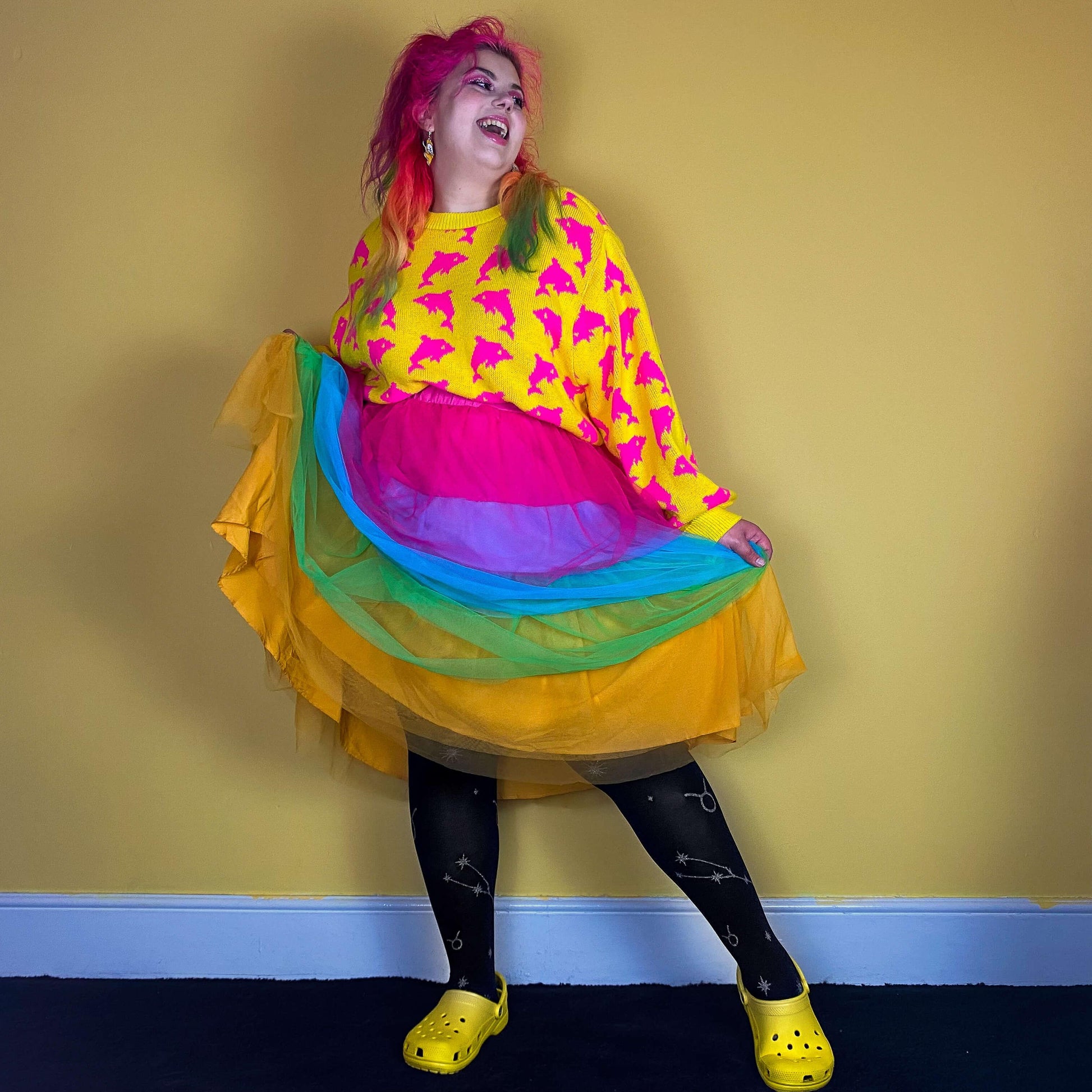 This jumper is the bomb! Sooo soft and stretchy and I love the bats and lightening. I am an F and 5ft tall (short?). Perfect length for me.